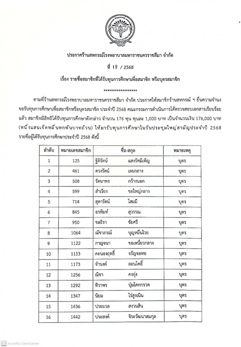 รายชื่อสมาชิกที่ได้รับทุนการศึกษาเพื่อสมาชิกหรือบุตรสมาชิก ปี 2568